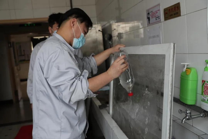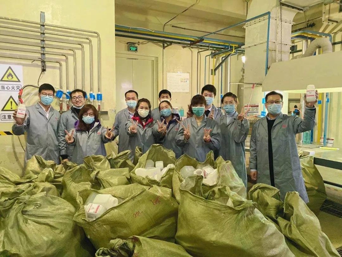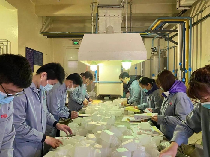 在聽取化工廠黨總支書記王金華、副廠長王云祥、安全總監李川介紹產品、貼簽安全相關事項后。總部團員青年們穿好工作服來到車間,經過2小時的勞動,共貼簽6000個,為企業生產貢獻一份綿薄之力。