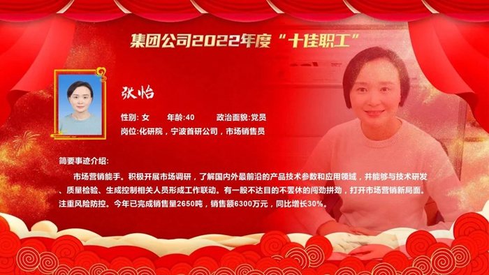 為激勵苦干實干、樹立身邊典型、打造先進品牌,不斷強化廣大職工“企業(yè)發(fā)展、我有責任,拼搏‘3+1’、我在行動”主人翁意識,促進企業(yè)高質(zhì)量發(fā)展,經(jīng)企業(yè)推薦、廣泛遴選、優(yōu)中選優(yōu)、民主集中、會議研究,北京化工集團決定,授予北京市化學工業(yè)研究院有限責任公司寧波首研公司市場銷售員張怡(女)等10名同志北京化工集團2022年度“十佳職工”,并在北京化工集團二屆一次職代會暨2023年度工作會上予以表彰。