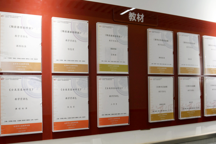 沒有成型的教材,王愛梅等老師就與這些特聘專家和技能大師一起探討,與團隊教師合作搭建課程體系。現(xiàn)已完成10門一體化課程標準和教材、學材的開發(fā),并打通了中高級直升人才培養(yǎng)機制,同時完成主編《陶瓷器基礎(chǔ)修復》《陶瓷器文物修復》,參編《金屬器修復》等課程資源包。