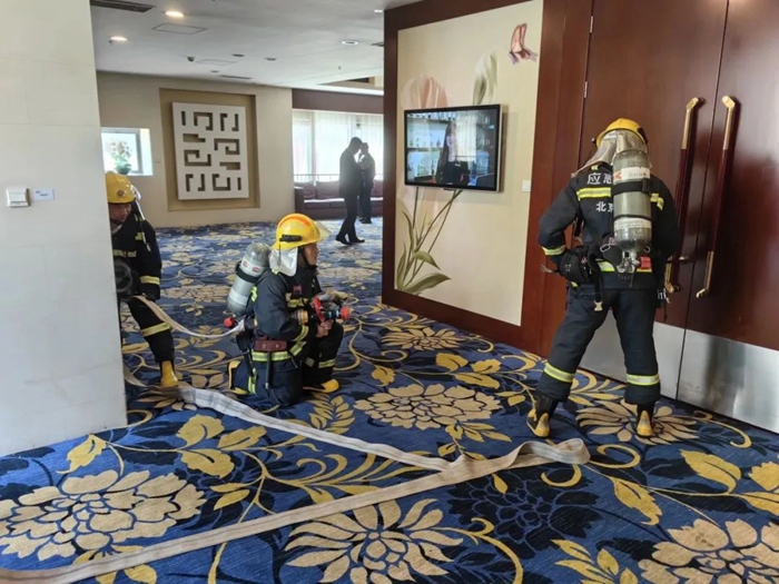 華騰美居酒店順利通過此次檢查考核。檢查結束后,為提高酒店應急救援實戰水平,勁松消防特勤站就地開展了一次火災救援現場演練,參演人員由特勤站救援人員和酒店微型消防站義務救援人員組成。演練取得圓滿成功。