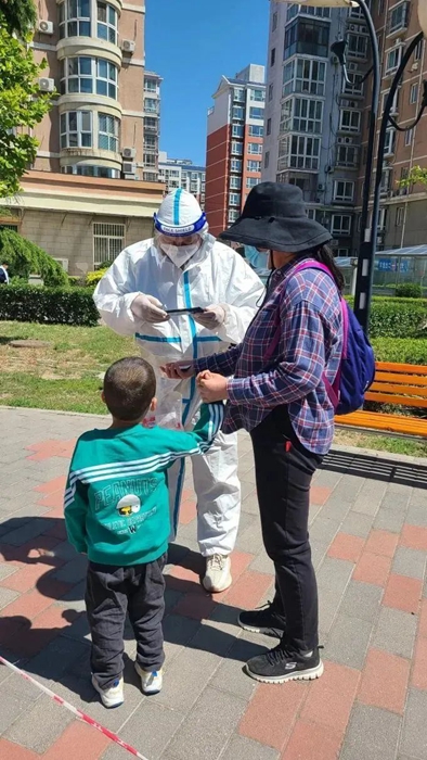 居家辦公的第二周,我主動聯系社區居委會,要求參加防疫志愿工作,不久就接到了居委會的電話,我被安排到核酸檢測一線。穿防護服上陣,作為核酸工作者之一,掃碼確認身份信息、發試劑盒。第一次要成為大白,有些好奇,有點開心,但更多的是自豪,非常時期可以為大家做點事情,感覺很榮幸。穿上防護服的時刻,一種使命感油然而生,感覺醫生這個職業更加神圣了。這幾天氣溫不算高,但穿上防護服后感受到了“保溫”的含義,口渴的時候還得忍著,因為大夫說要注意安全,不能亂動。連續幾天的工作, 各種人都見過了,有發牢騷的、有不理解的,但更多的是友善的問候、謝謝的言語,雖然聽到牢騷話心里不開心,但每每聽到一聲“你好”或“謝謝”,心里所有的不愉快都煙消云散了。