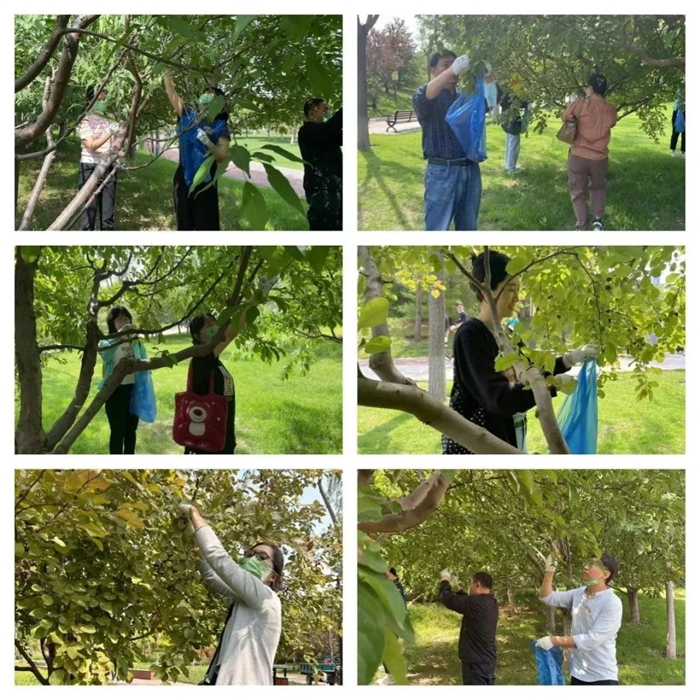 此次活動內(nèi)容為樹木疏果,顧名思義,疏果就是疏除多余的果實,最大限度減少樹體的無效養(yǎng)分消耗,集中營養(yǎng)。通過疏果,可調(diào)節(jié)樹體健壯。工作內(nèi)容雖然簡單,但大家仍然認真聆聽公園工作人員對此次活動內(nèi)容的講解,絲毫沒有怠慢的想法。活動中大家熱情高漲,自動分組,有人負責(zé)海棠樹有人負責(zé)桃樹,一切井然有序。