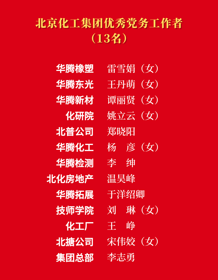 為熱烈慶祝中國(guó)共產(chǎn)黨成立103周年,大力表彰在推進(jìn)“十四五”規(guī)劃、推動(dòng)集團(tuán)“231”戰(zhàn)略布局、完成重點(diǎn)工作任務(wù)等各方面涌現(xiàn)出來的先進(jìn)集體和先進(jìn)個(gè)人,市國(guó)資委黨委決定,授予北搪黨委“先進(jìn)基層黨組織”稱號(hào),授予技師學(xué)院姜洪強(qiáng)“優(yōu)秀共產(chǎn)黨員”稱號(hào),授予北京化工集團(tuán)總部李志勇“優(yōu)秀黨務(wù)工作者”稱號(hào);北京化工集團(tuán)黨委決定,授予14個(gè)黨支部“先進(jìn)基層黨支部”稱號(hào),授予29名同志“優(yōu)秀共產(chǎn)黨員”稱號(hào),授予13名同志“優(yōu)秀黨務(wù)工作者”稱號(hào)。