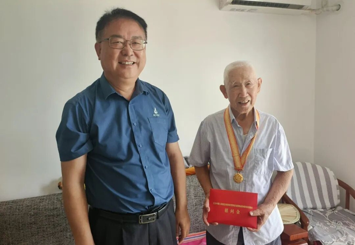 北京化工集團黨委高度重視紀念章頒發工作,黨委書記、董事長陳宇等集團領導帶隊向抗戰老戰士、老同志吳新華、焦鐵、崔震頒發紀念章,向老戰士、老同志們致以崇高敬意、親切慰問。
