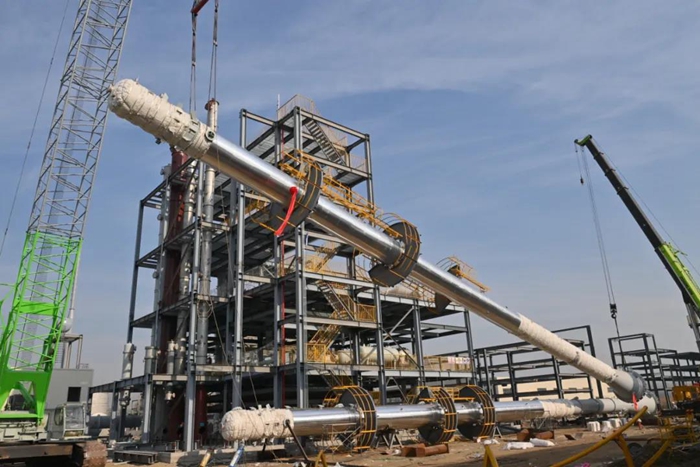PAE(聚芳醚)項目自2021年3月份啟動以來,在北京化工集團的統(tǒng)一指揮協(xié)調(diào)下,經(jīng)過京騰昊樺公司及所有參建單位的共同努力,項目建設(shè)按計劃有序推進。此次兩座精餾塔成功吊裝到位,標(biāo)志著PAE項目土建任務(wù)全面收官,全面進入設(shè)備安裝調(diào)試階段。