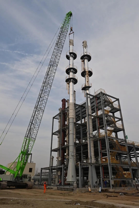 兩座精餾塔中的單體精餾單元,高達48米,是PAE(聚芳醚)項目最高裝置。為高質(zhì)量完成吊裝任務(wù),京騰昊樺干部職工統(tǒng)一協(xié)調(diào),相繼完成了基礎(chǔ)復(fù)核、標(biāo)高復(fù)核、吊裝位置復(fù)核等前期工作,并同步完成保溫層、爬梯和平臺的安裝。